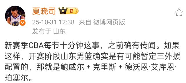 根据目前的消息,新赛季每节比赛改成了10分钟,山东男篮也决定赛季初期只使用三名外援,这样一来新赛季的外援全部确定。